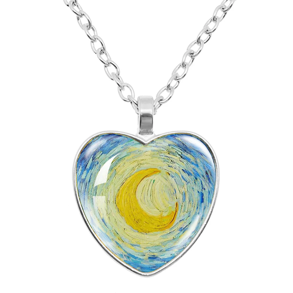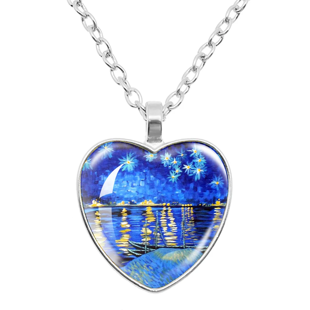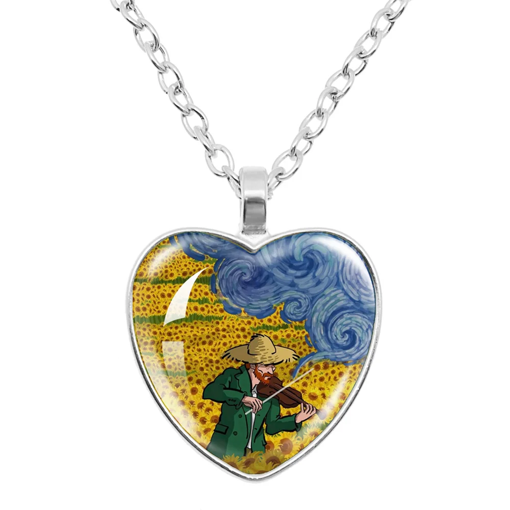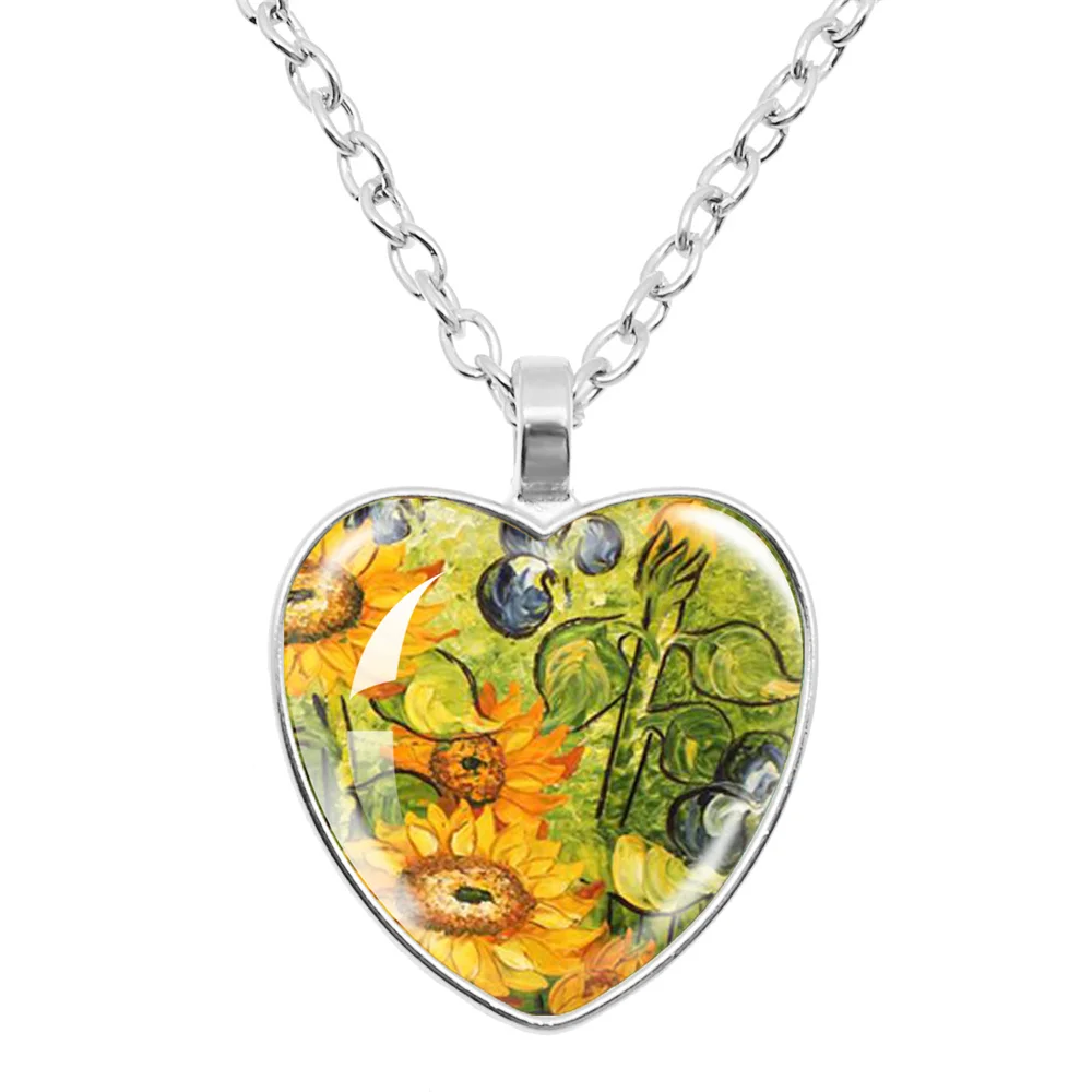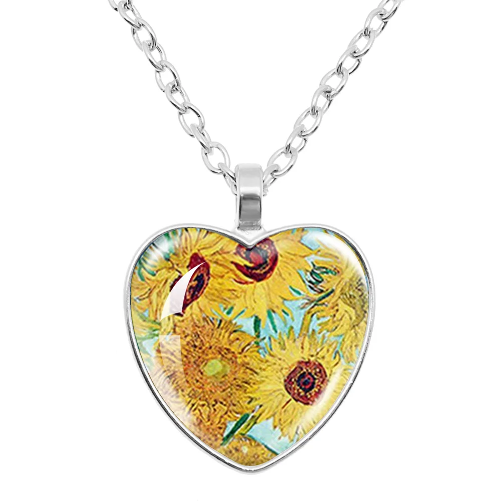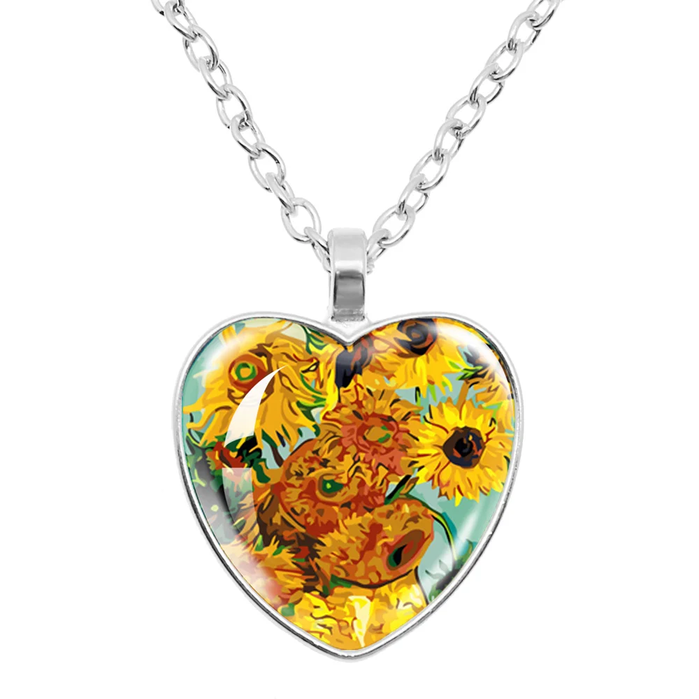 Fashion Van Gogh Art Starry Night Sunflower Necklace Glass Cabochon Painting Heart Pendant Printed Photo Necklaces