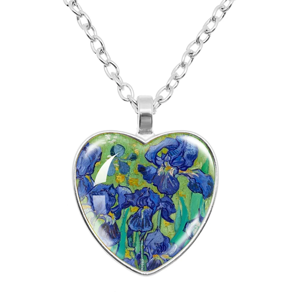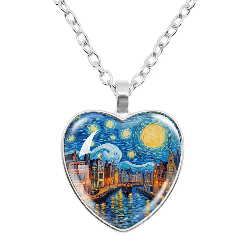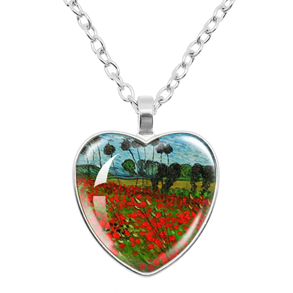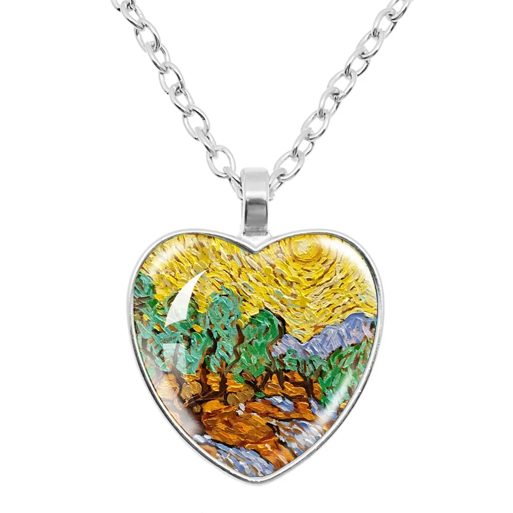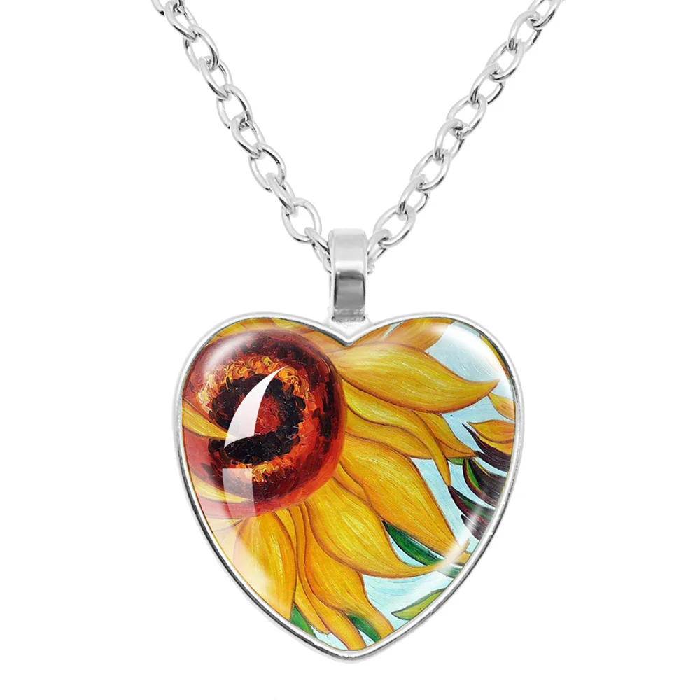 Fashion Van Gogh Art Starry Night Sunflower Necklace Glass Cabochon Painting Heart Pendant Printed Photo Necklaces