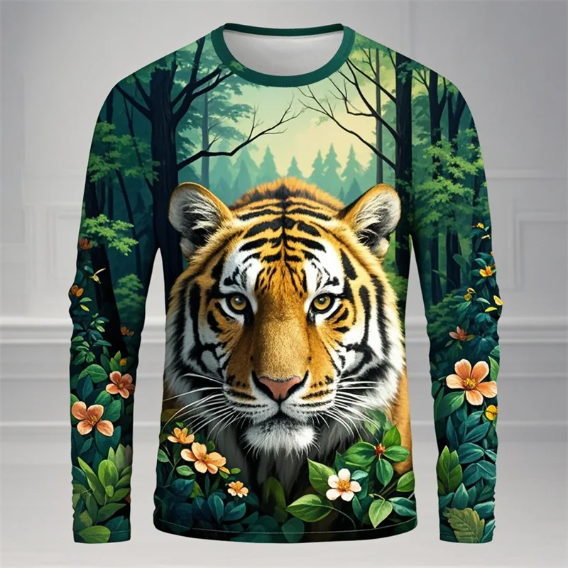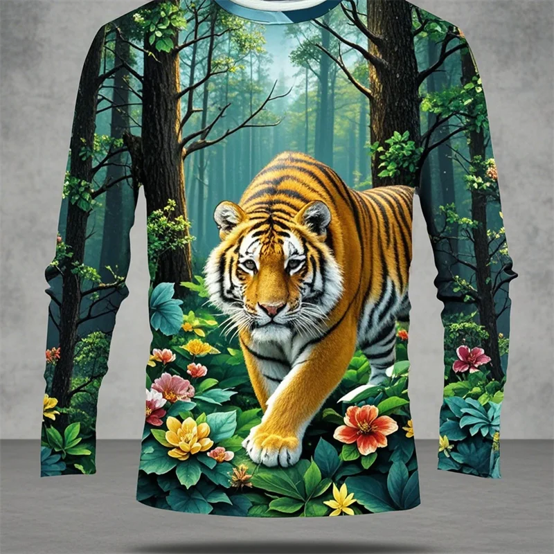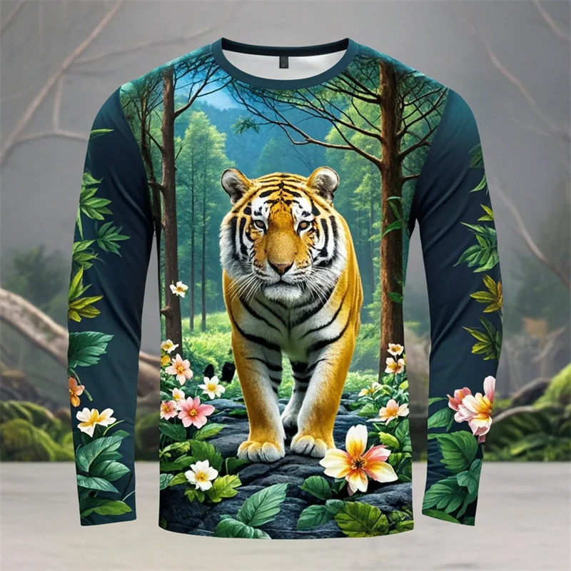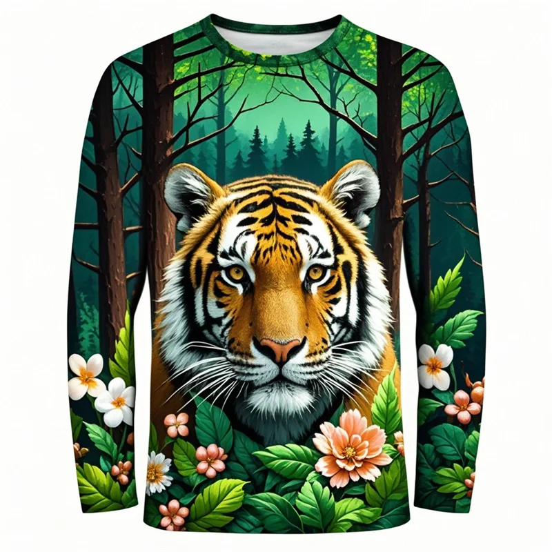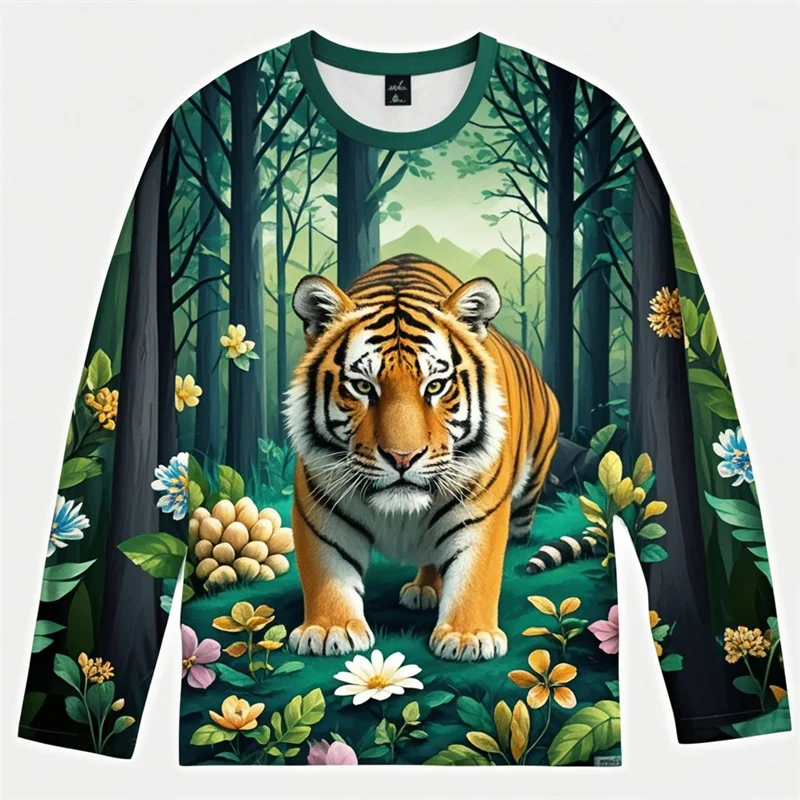 Forest Tiger Graphic T Shirts Harajuku Animal 3D Print Long Sleeve T Shirt For Men Clothes Comfy Unisex Streetwear Boy Tee Tops