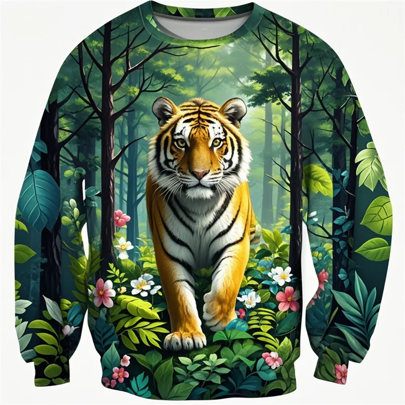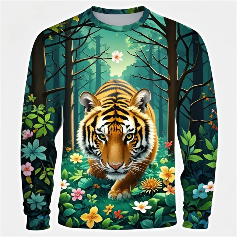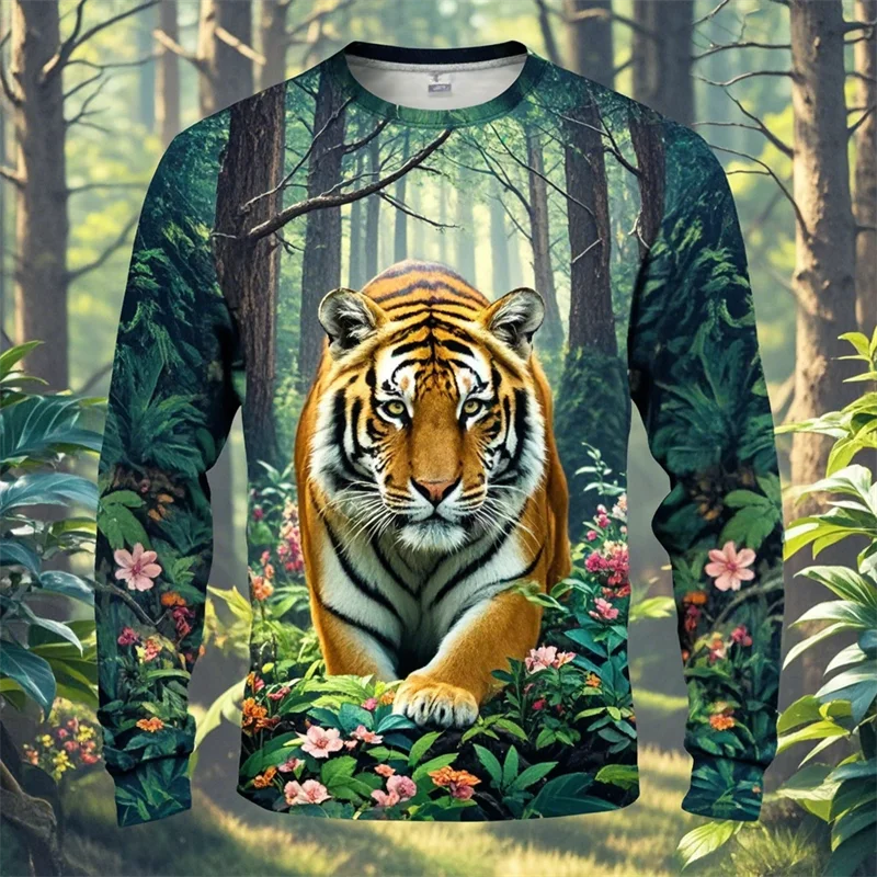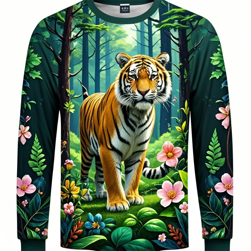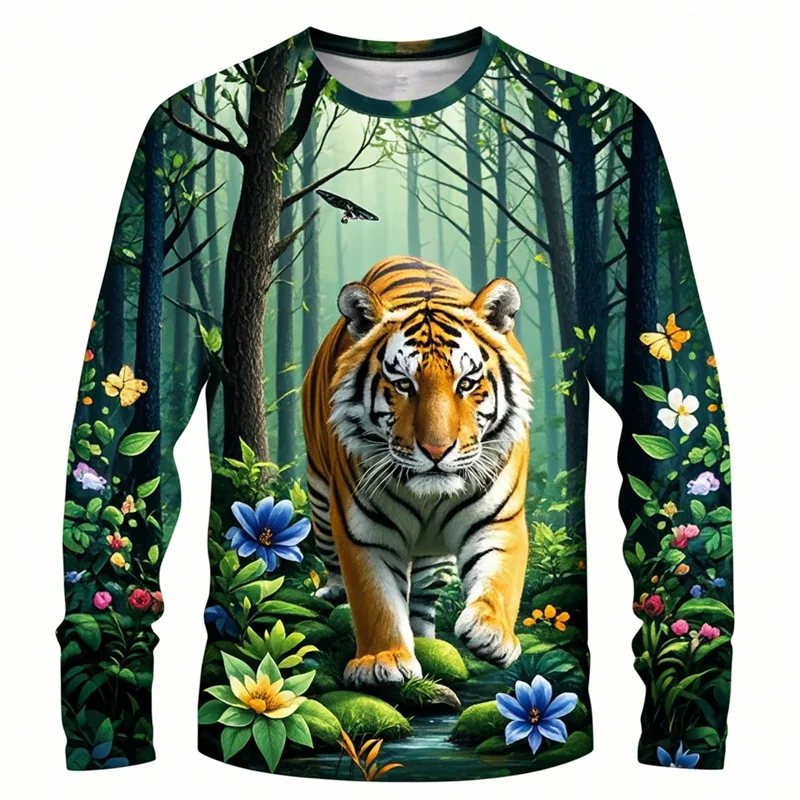 Forest Tiger Graphic T Shirts Harajuku Animal 3D Print Long Sleeve T Shirt For Men Clothes Comfy Unisex Streetwear Boy Tee Tops