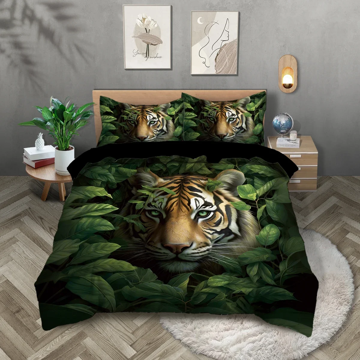 3pcs Tiger in the jungle pattern bedding set, 1 duvet cover and 2 pillowcases, for teenagers and adults bedroom, birthday gift