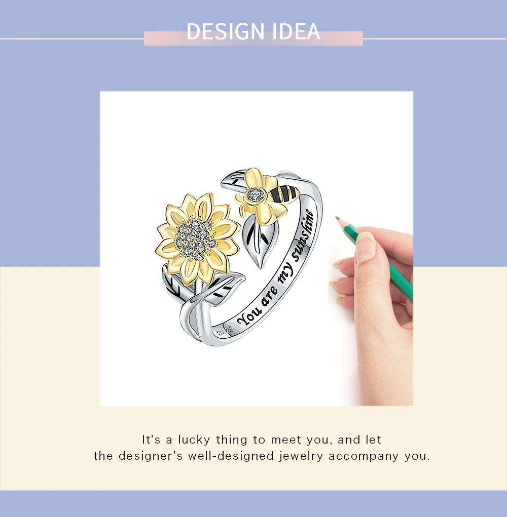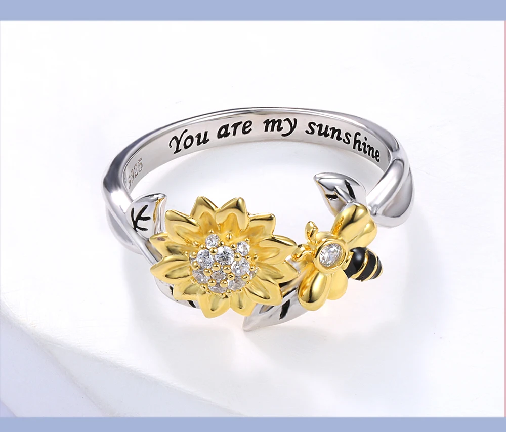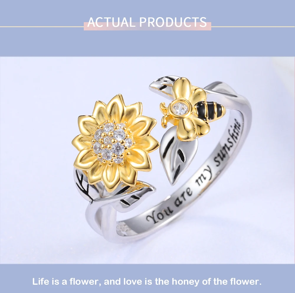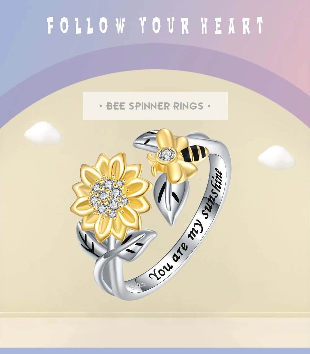 ❣DESIGN❣ Silver Spinner Sunflower Bee Ring - Bumble Bee with sunflower represents nature's animal and plant world love, with " You are my sunshine " engraved, symbol of you are my "honey" and sunshine; the sunflower could be spinnered, not only could you spin it to find your inner peace and get rid of fidget anxiety, also it will bring the love and happiness to you when you spin it. Wearing it, show your unique beauty!